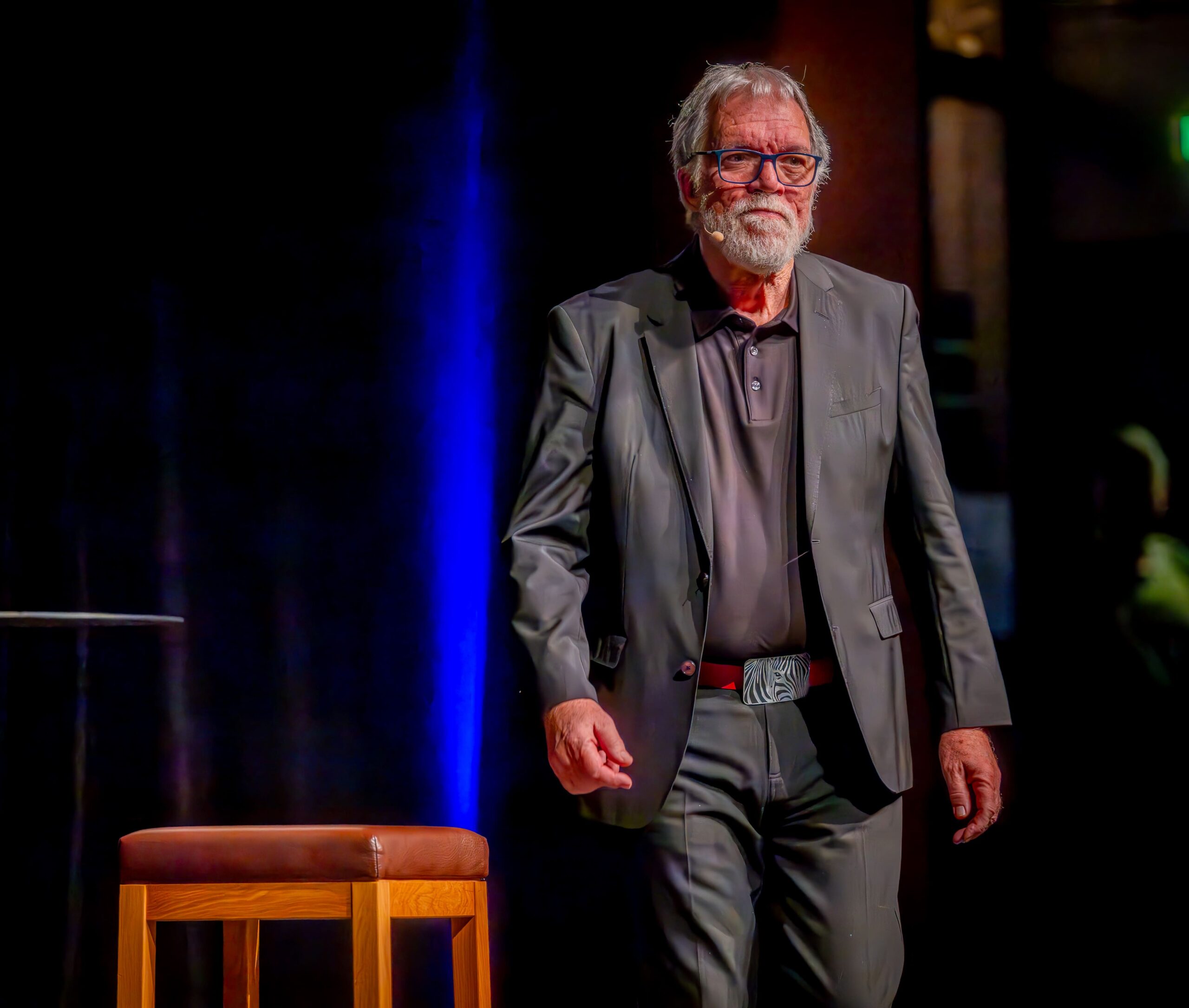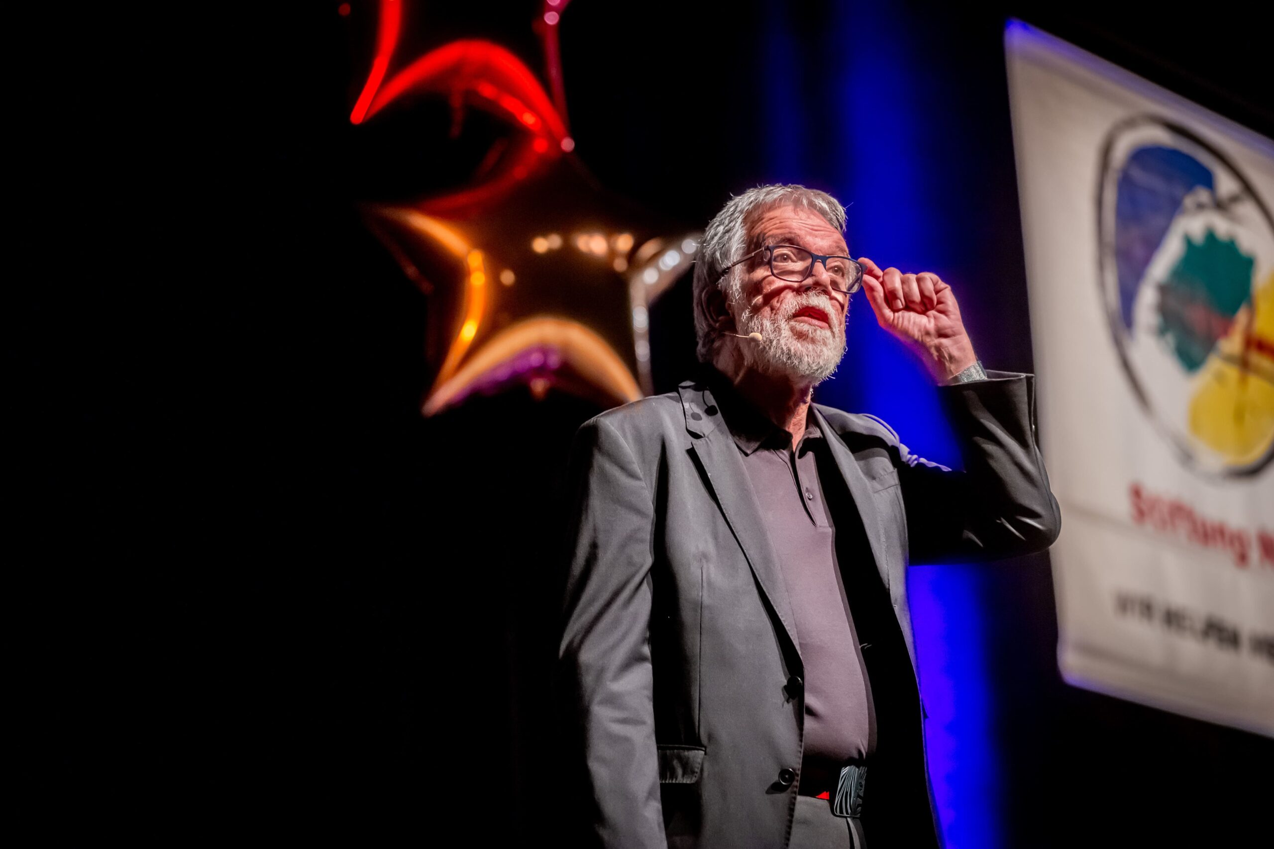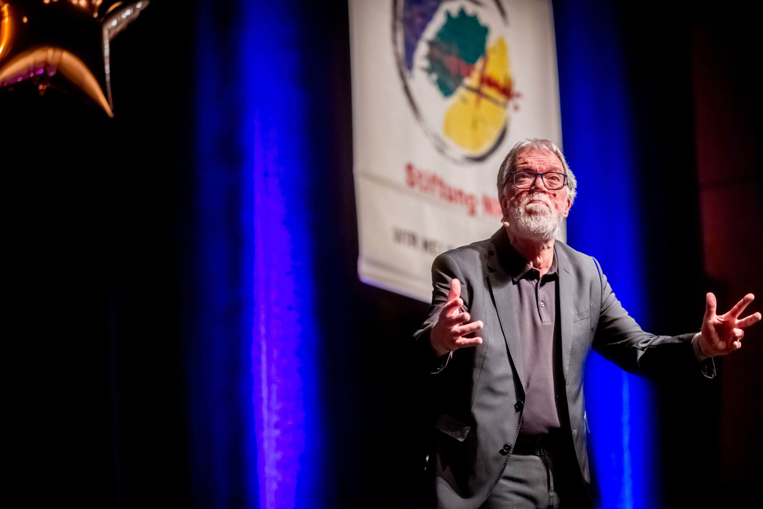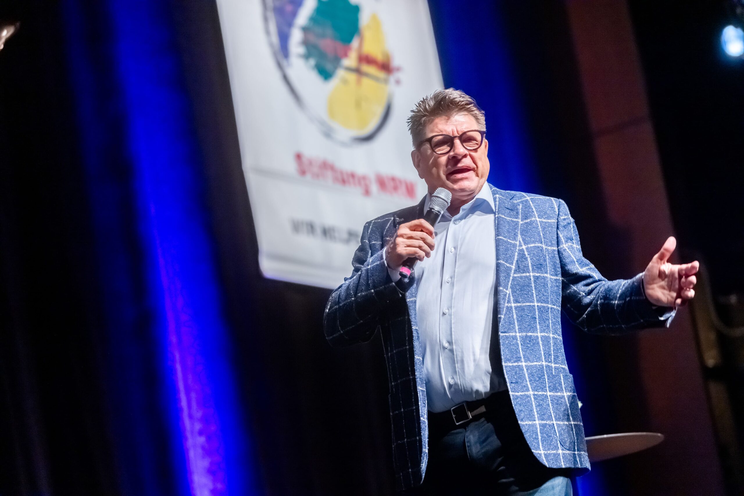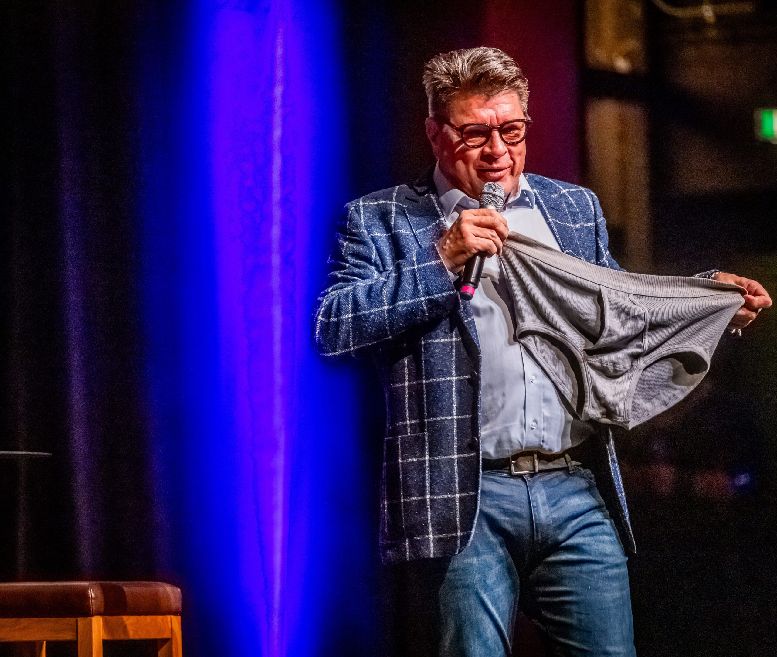 Wie Torsten Sträter ist auch Wolfgang Trepper als Stiftungs-Botschafter ein enger Partner des Solidarfonds. Im Saalbau zieht der Duisburger, der das Granteln zum Geschäftsprinzip erhoben hat, schon seit mehr als zehn Jahren vom Leder. Auch diesmal ging’s zurück in den 70er, in eine Zeit, in der jedes Kind diesen Satz der Eltern hörte: „Wenn du den Teller leer isst, gibt’s schönes Wetter!“ Das Ergebnis Jahrzehnte später ist alarmierend: „Adipositas und Klimawandel.“