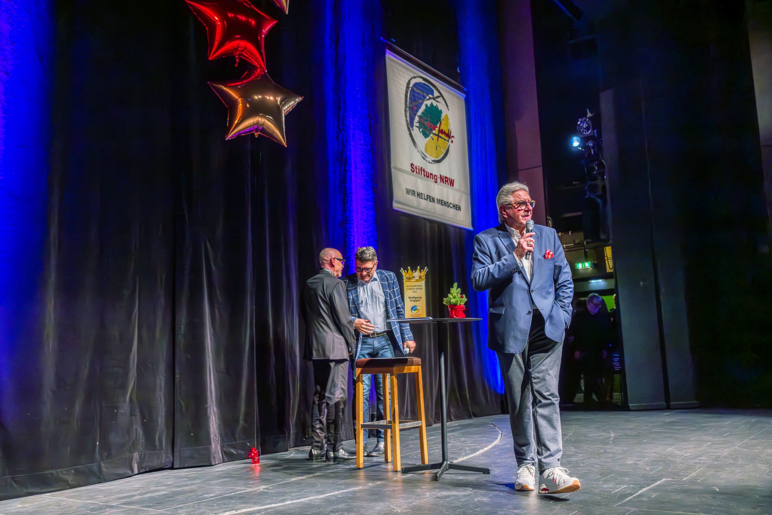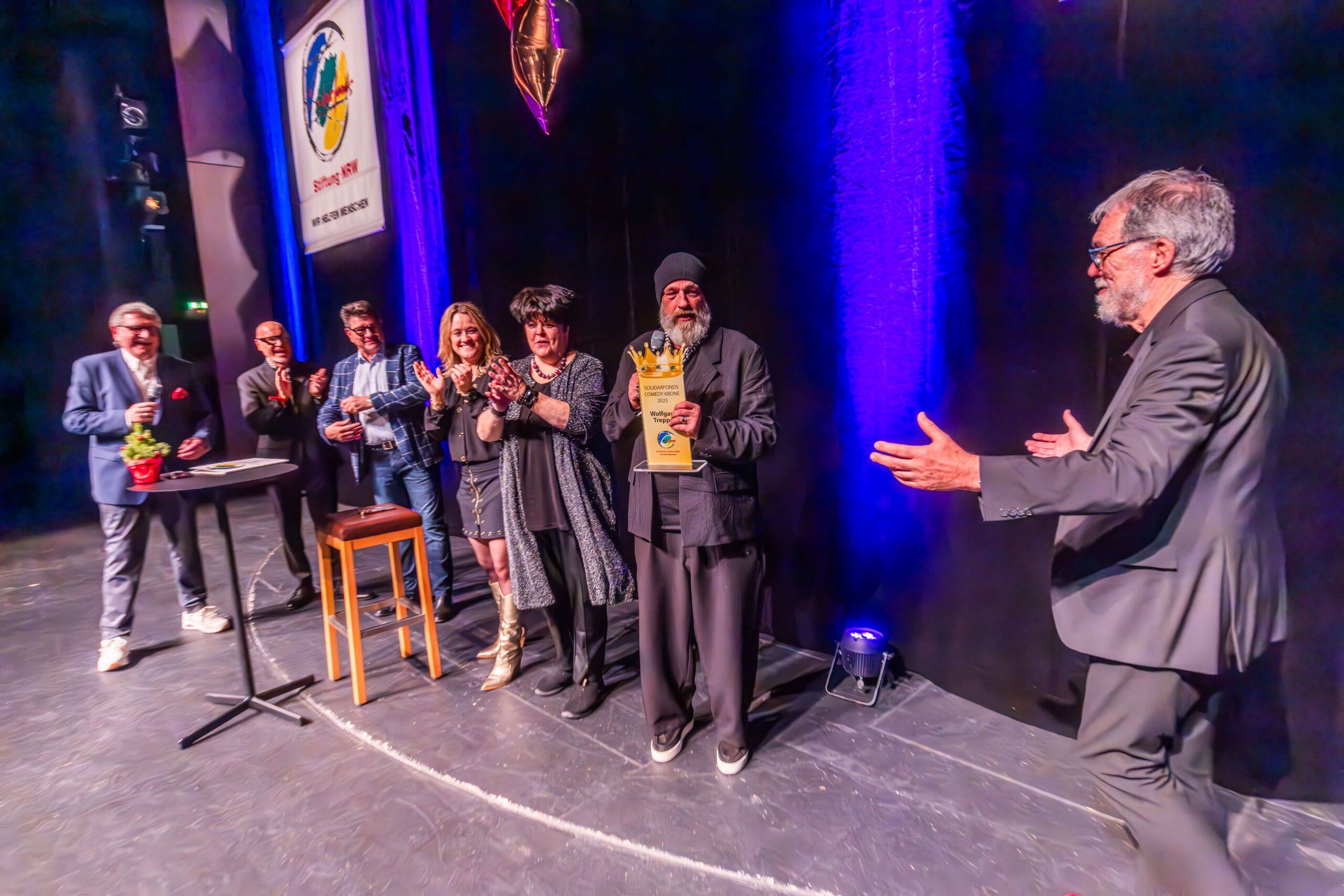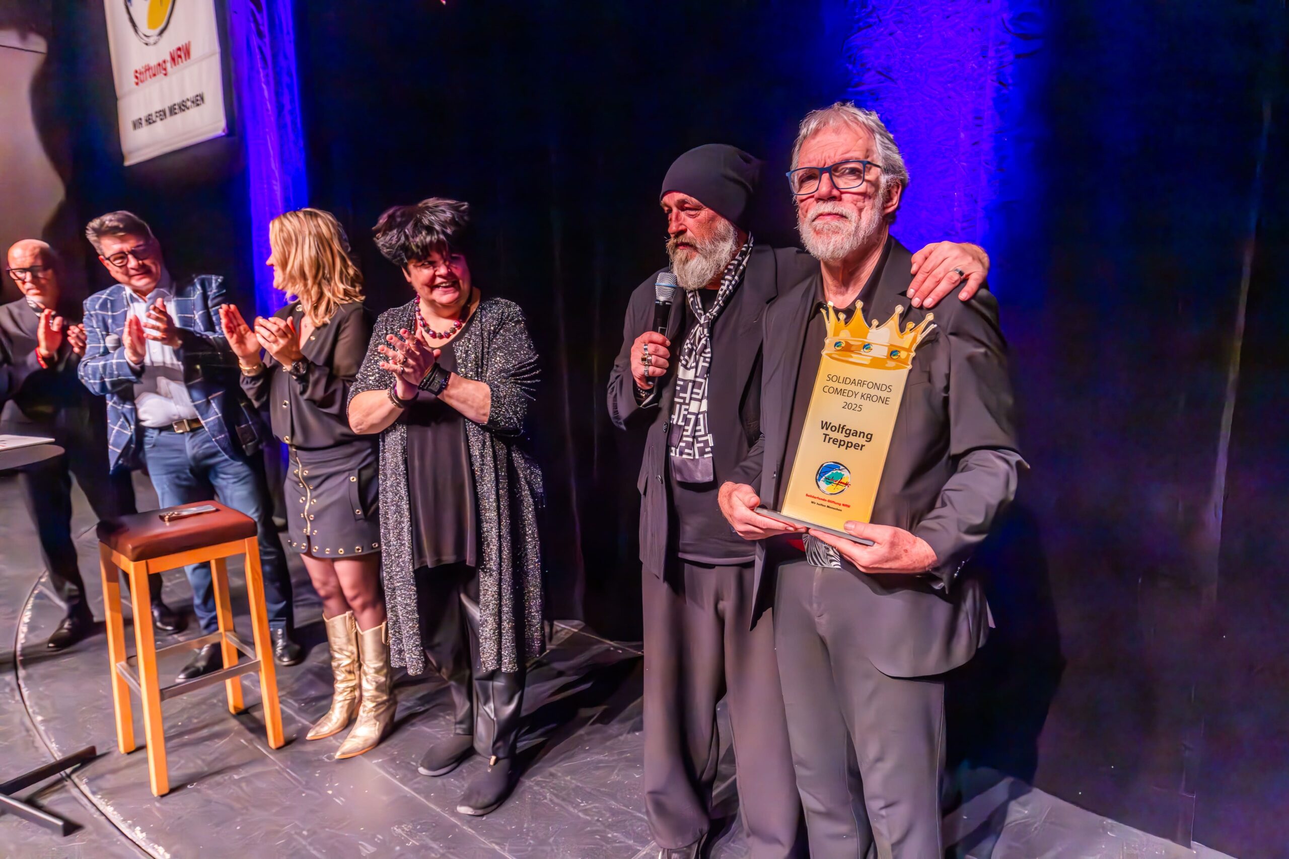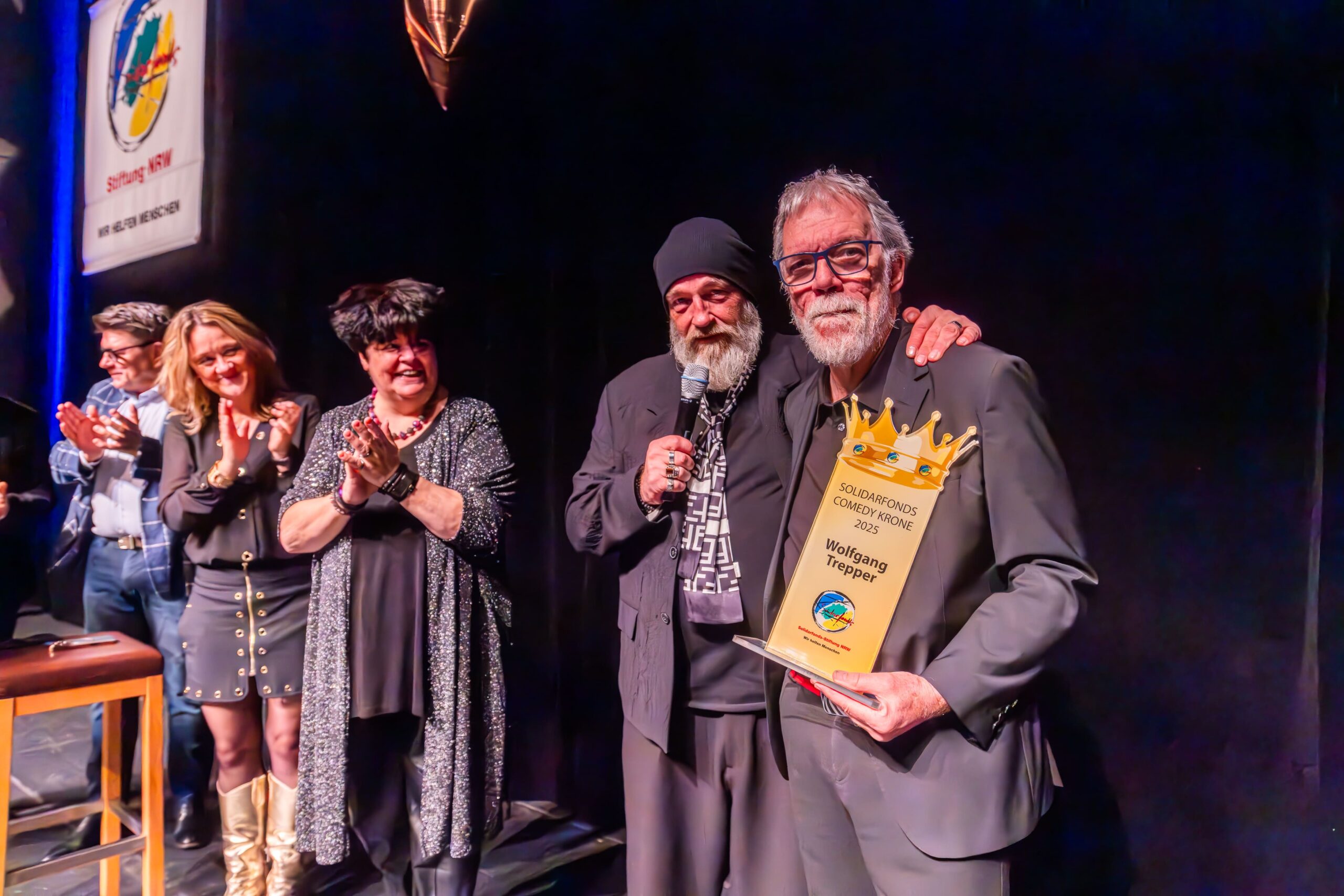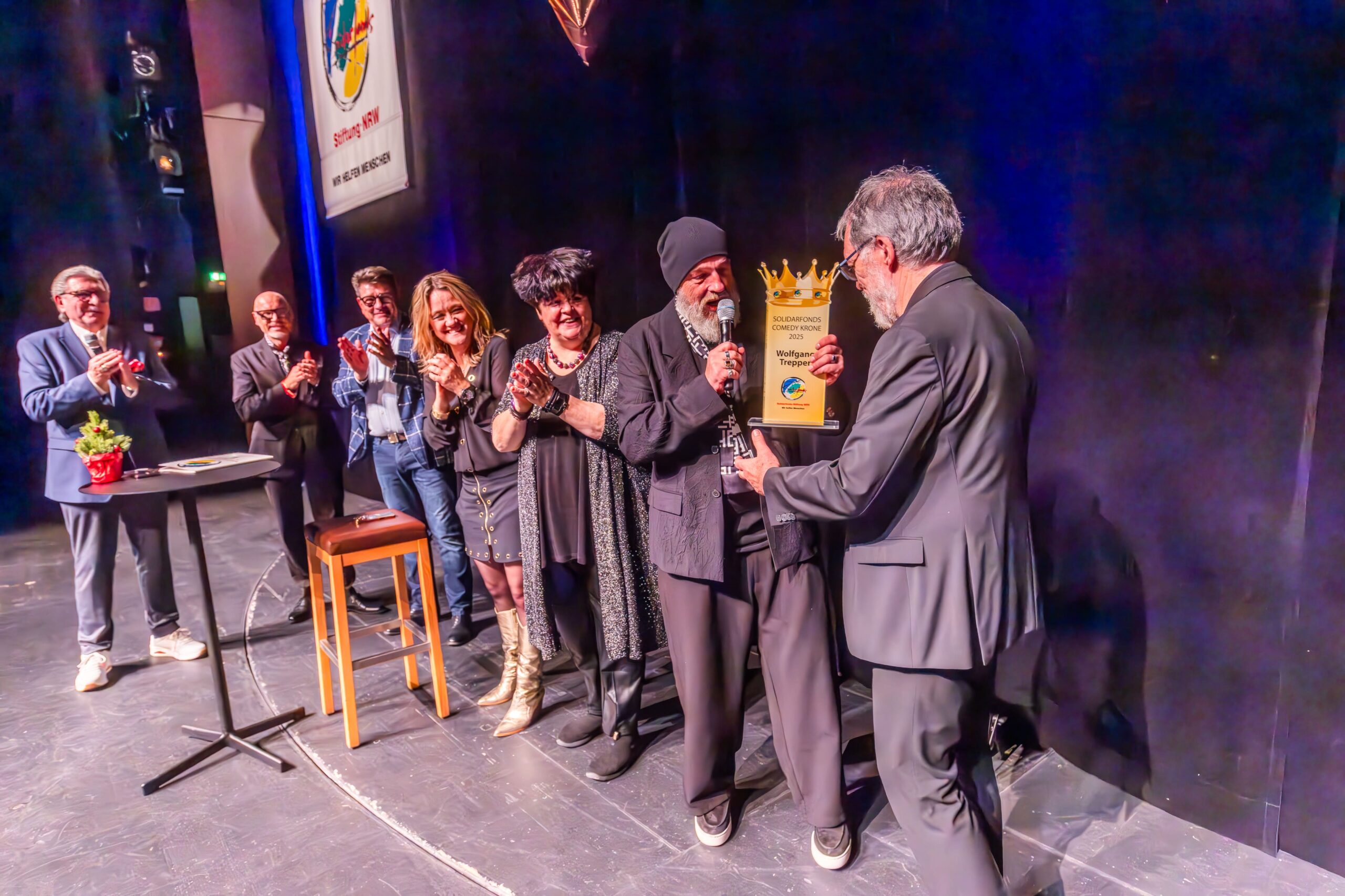 Zum Finale wurde es feierlich: Dr. Michael Kohlmann überreichte mit dem Schlagersänger und Stiftungs-Vorstandskollegen Olaf Henning die Goldene Comedy-Krone an Wolfgang Trepper. Der Preis wurde zum zweiten Mal für besondere Verdienste für die Solidarfonds-Stiftung NRW verliehen. Erster Preisträger war 2024 Torsten Sträter.