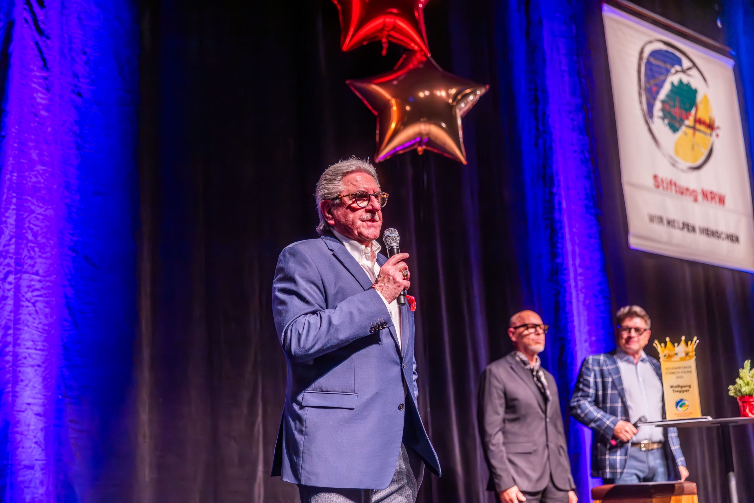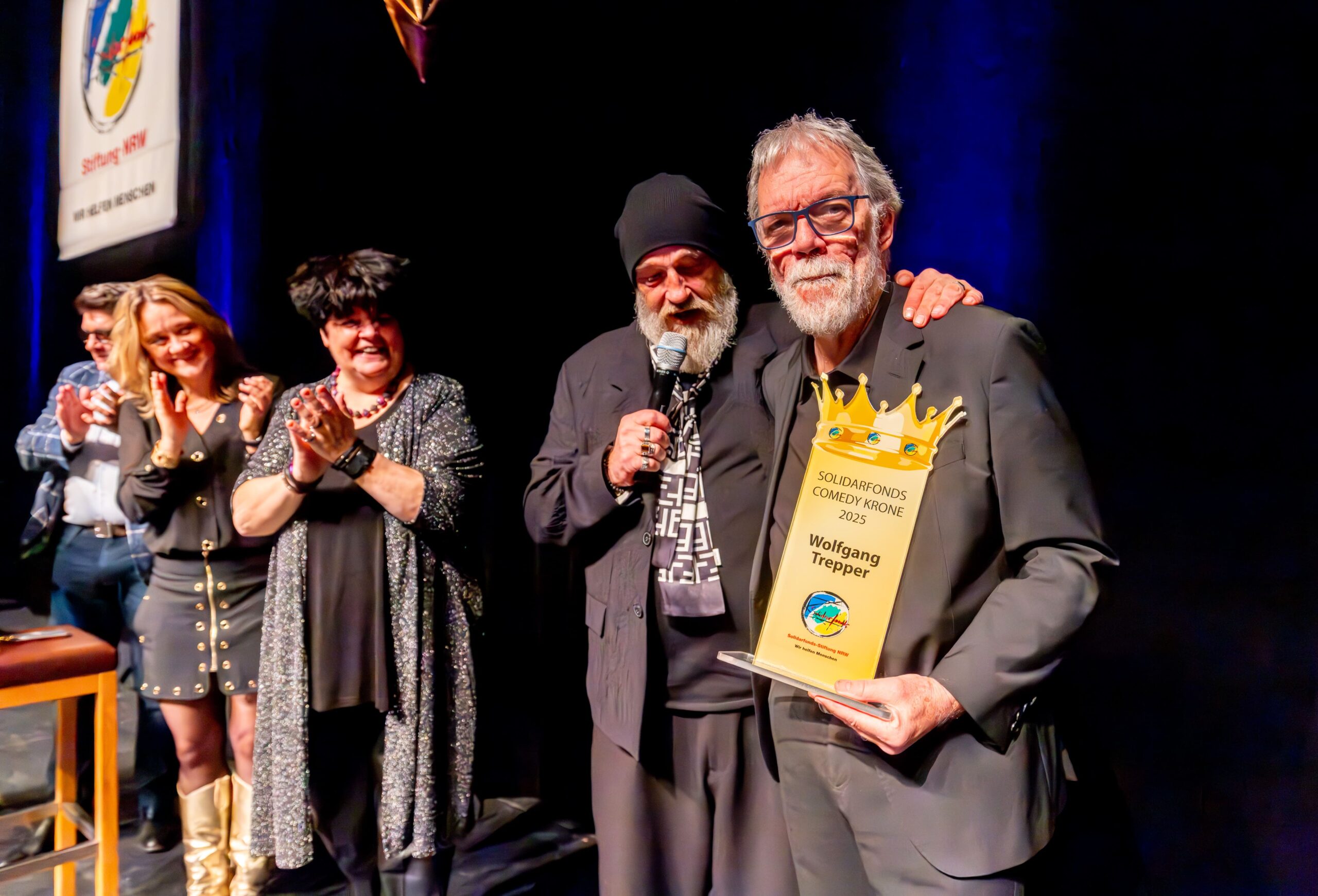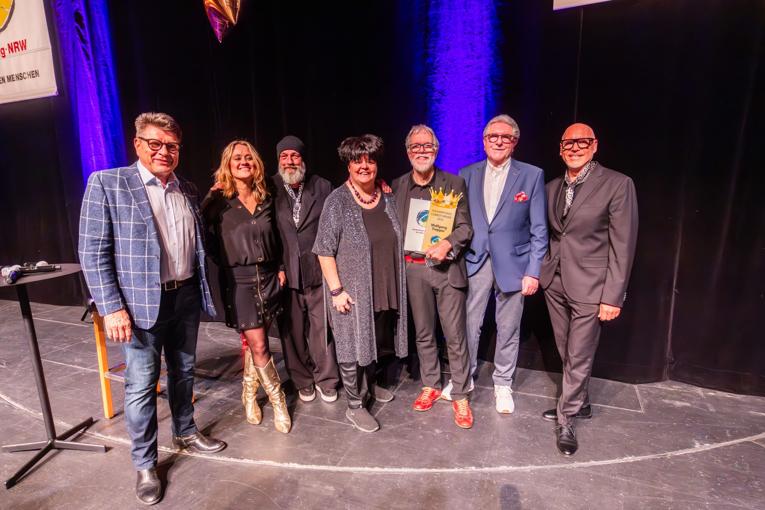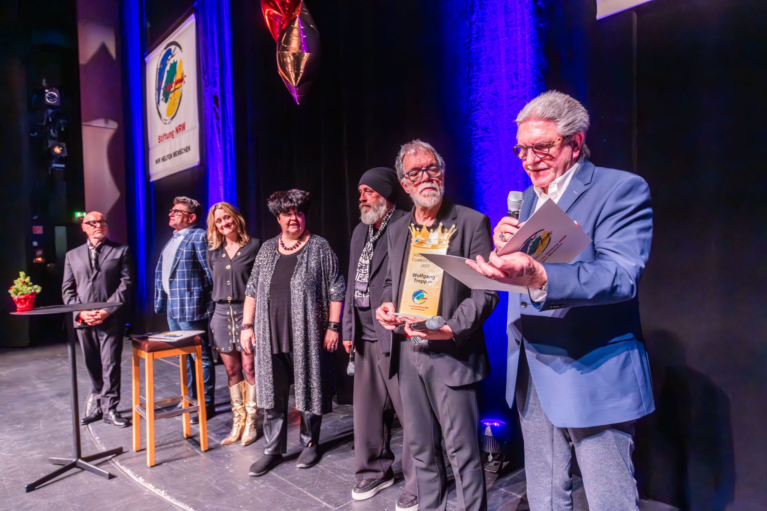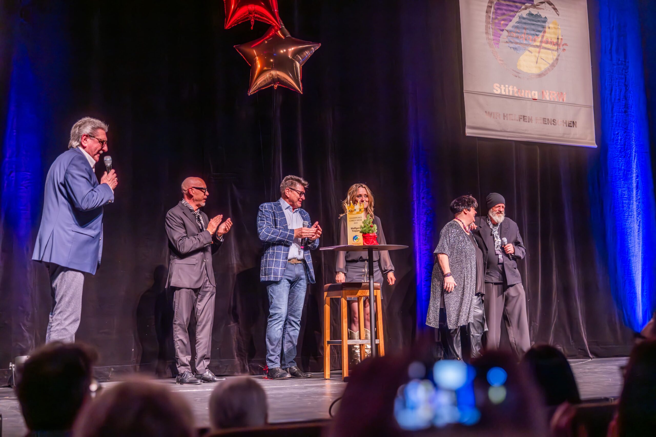 Zum Finale wurde es feierlich: Dr. Michael Kohlmann überreichte mit dem Schlagersänger und Stiftungs-Vorstandskollegen Olaf Henning die Goldene Comedy-Krone an Wolfgang Trepper. Der Preis wurde zum zweiten Mal für besondere Verdienste für die Solidarfonds-Stiftung NRW verliehen. Erster Preisträger war 2024 Torsten Sträter.