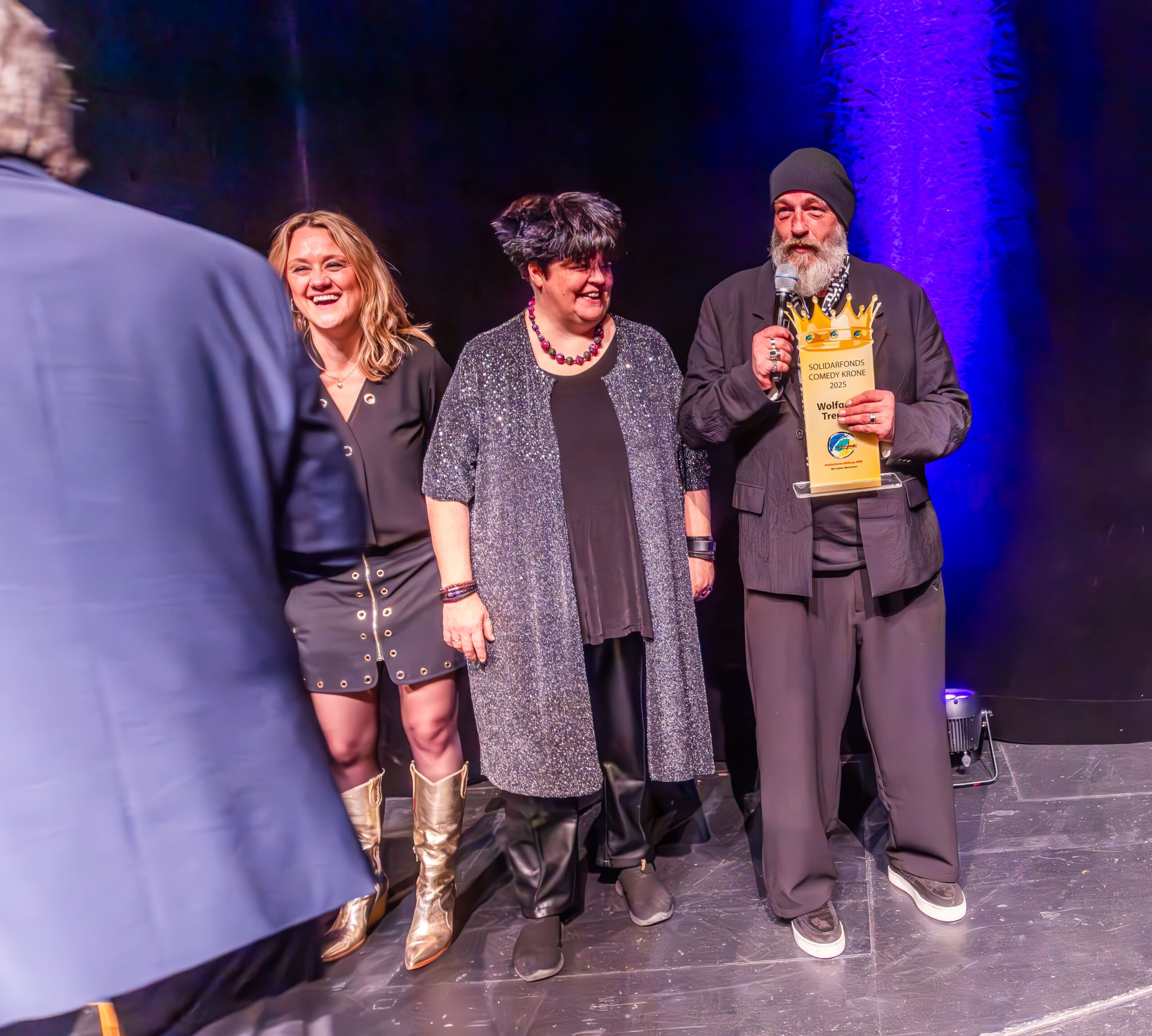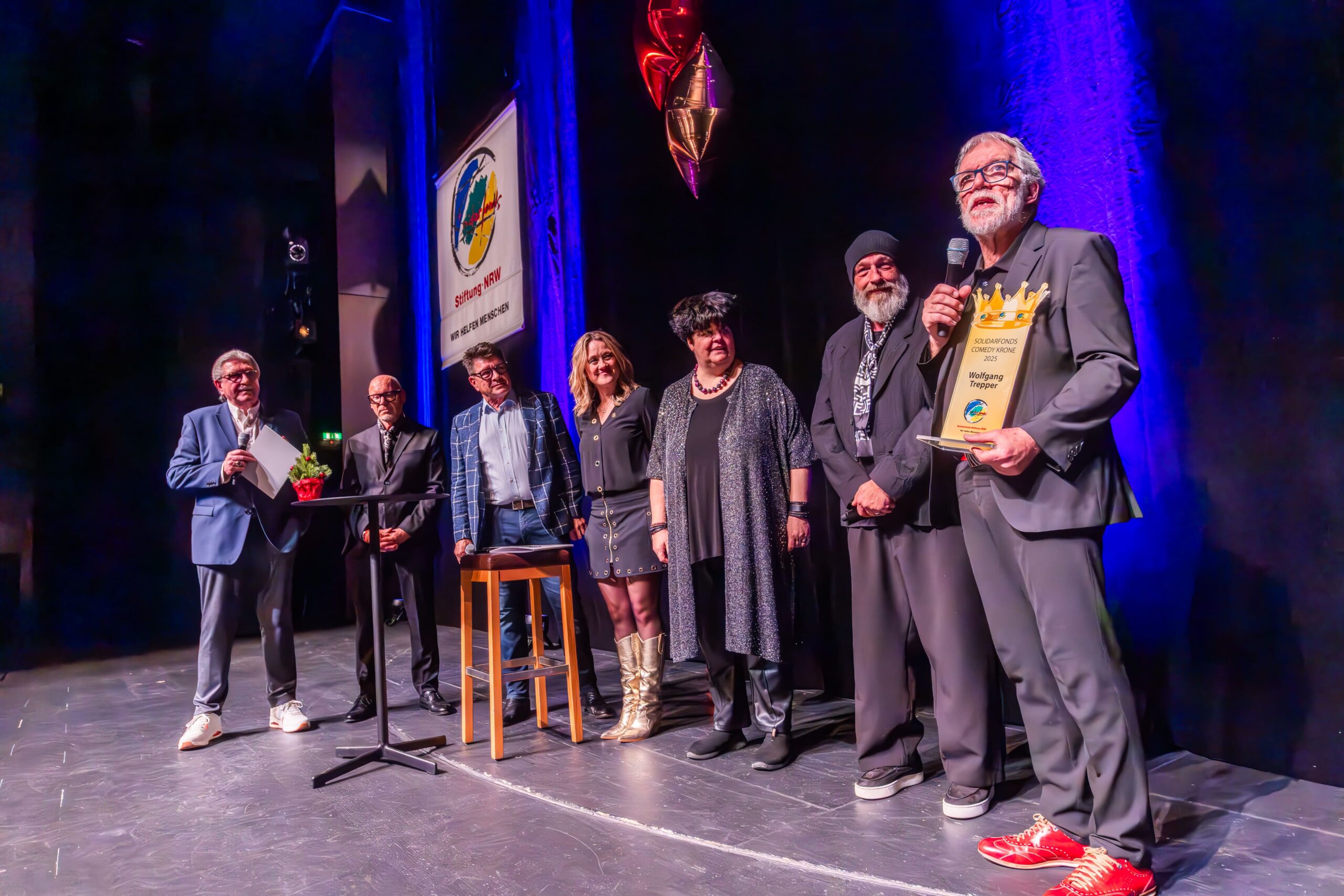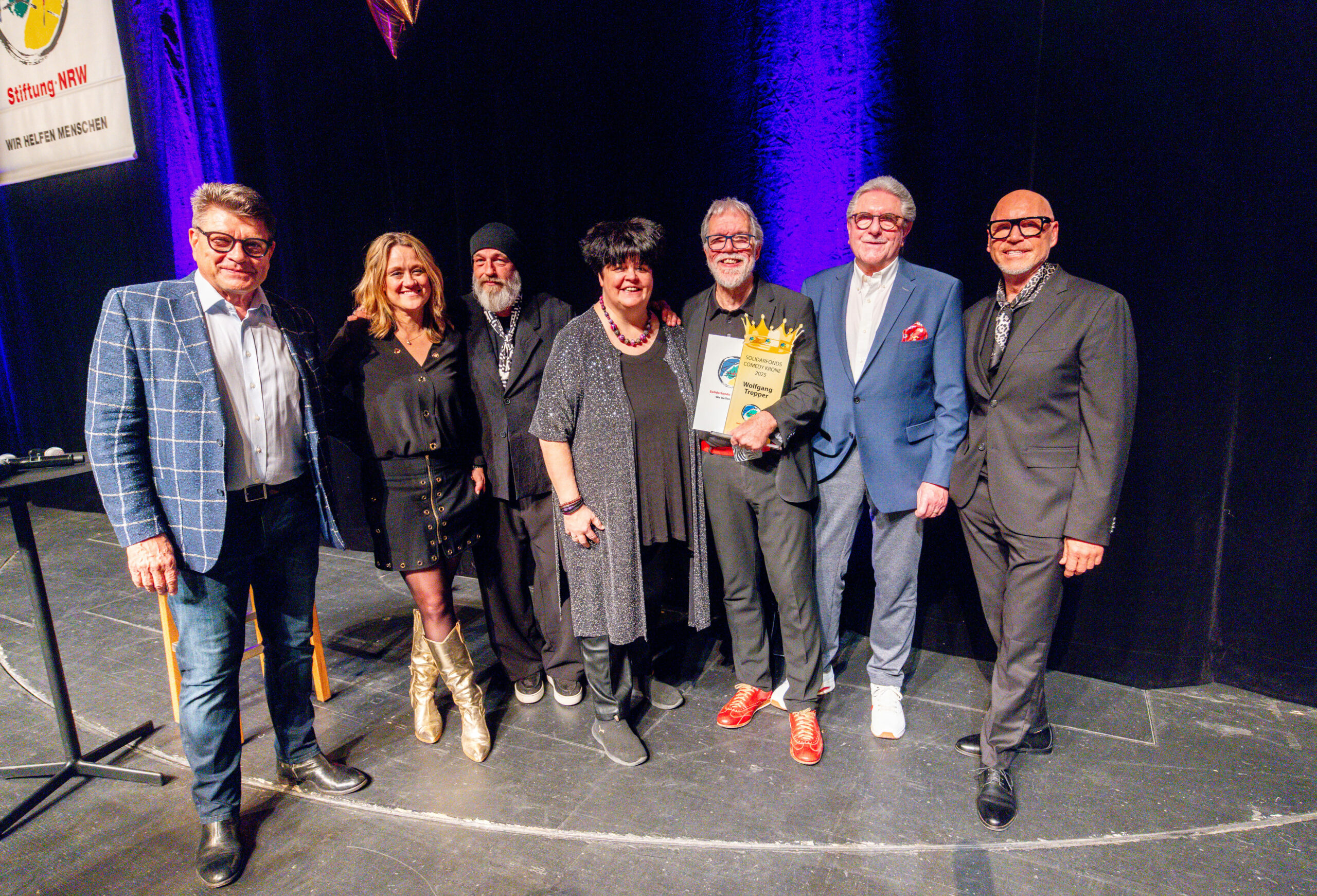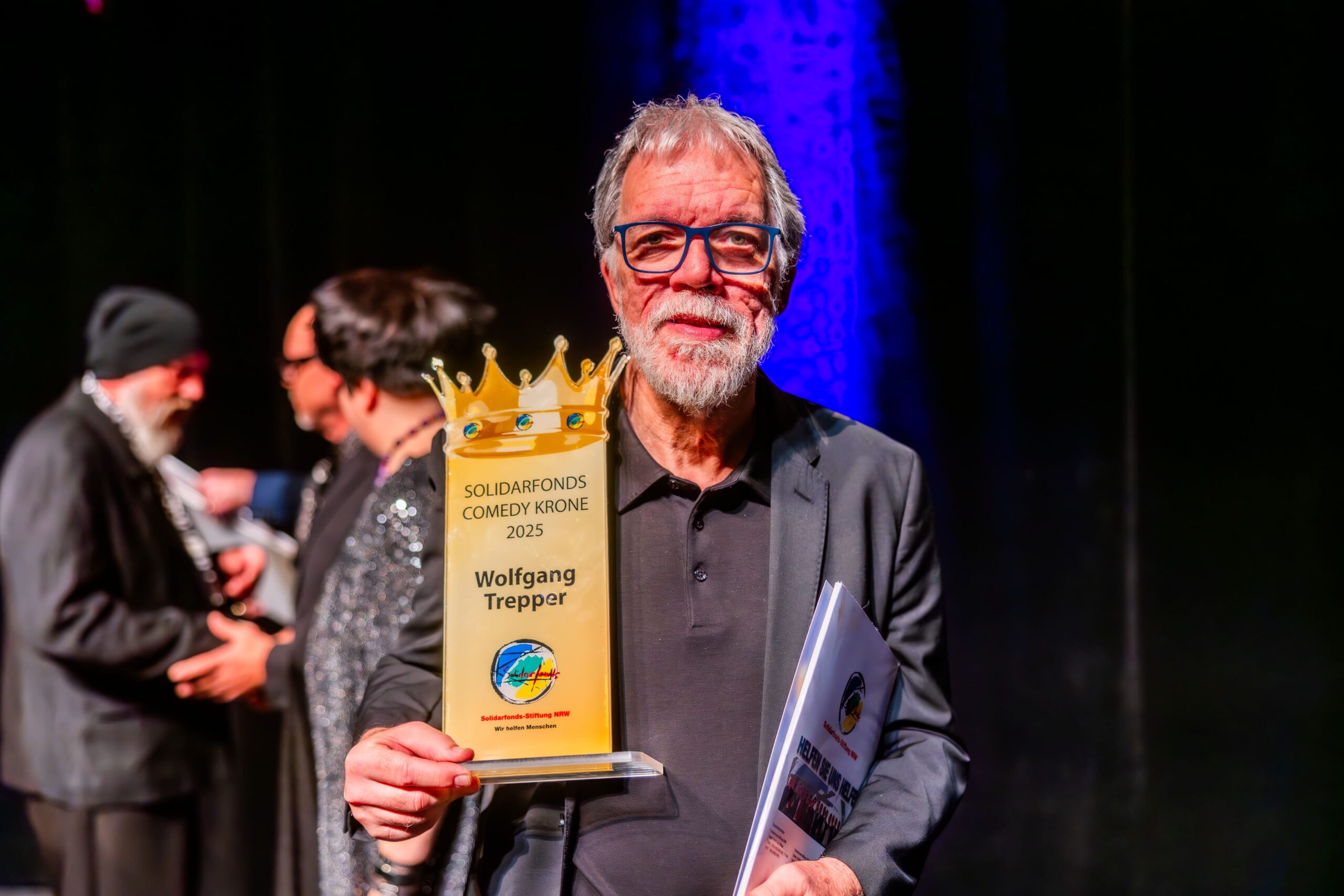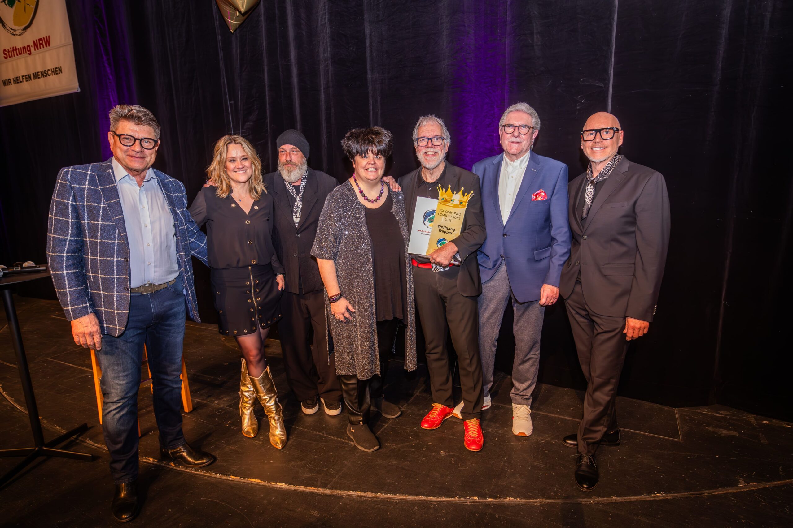 Zum Finale wurde es feierlich: Dr. Michael Kohlmann überreichte mit dem Schlagersänger und Stiftungs-Vorstandskollegen Olaf Henning die Goldene Comedy-Krone an Wolfgang Trepper. Der Preis wurde zum zweiten Mal für besondere Verdienste für die Solidarfonds-Stiftung NRW verliehen. Erster Preisträger war 2024 Torsten Sträter.