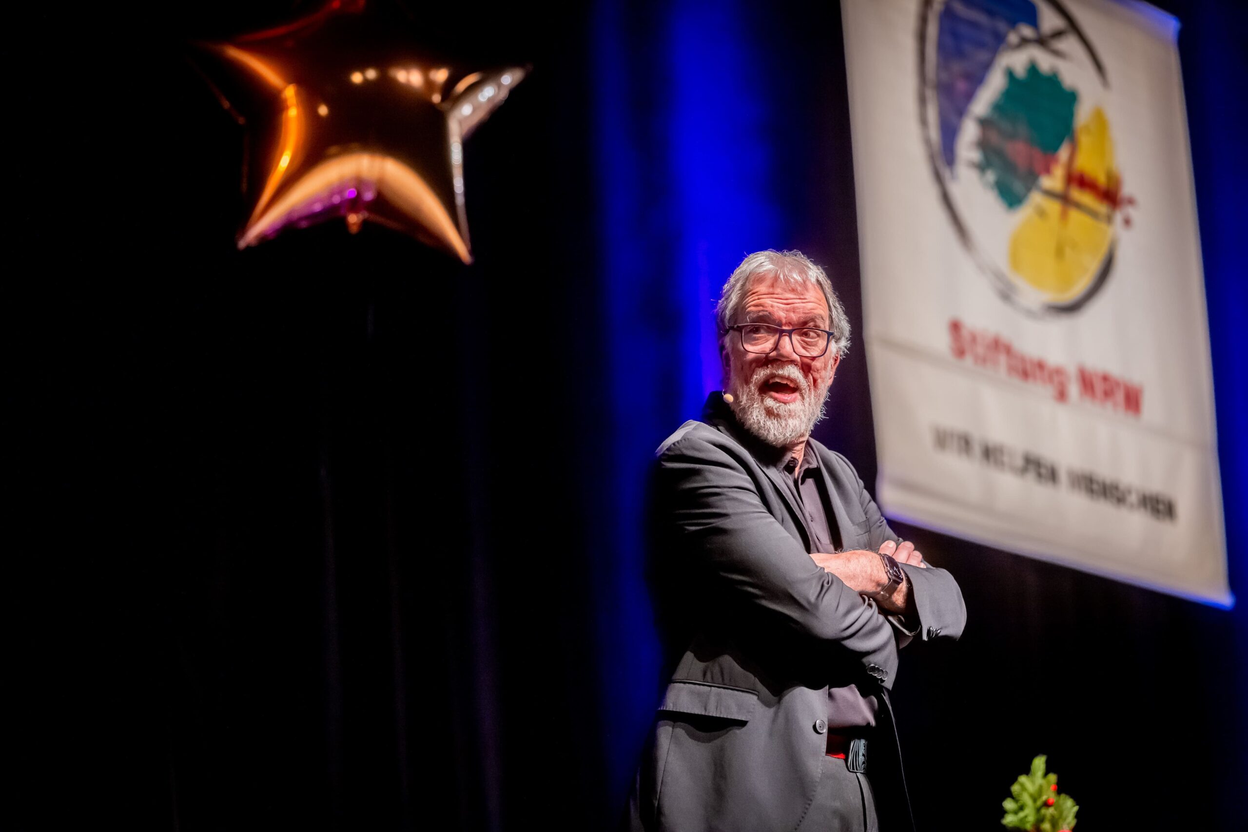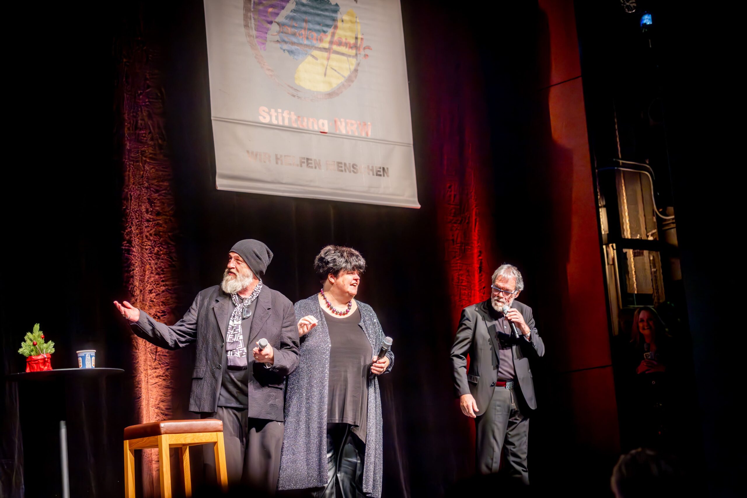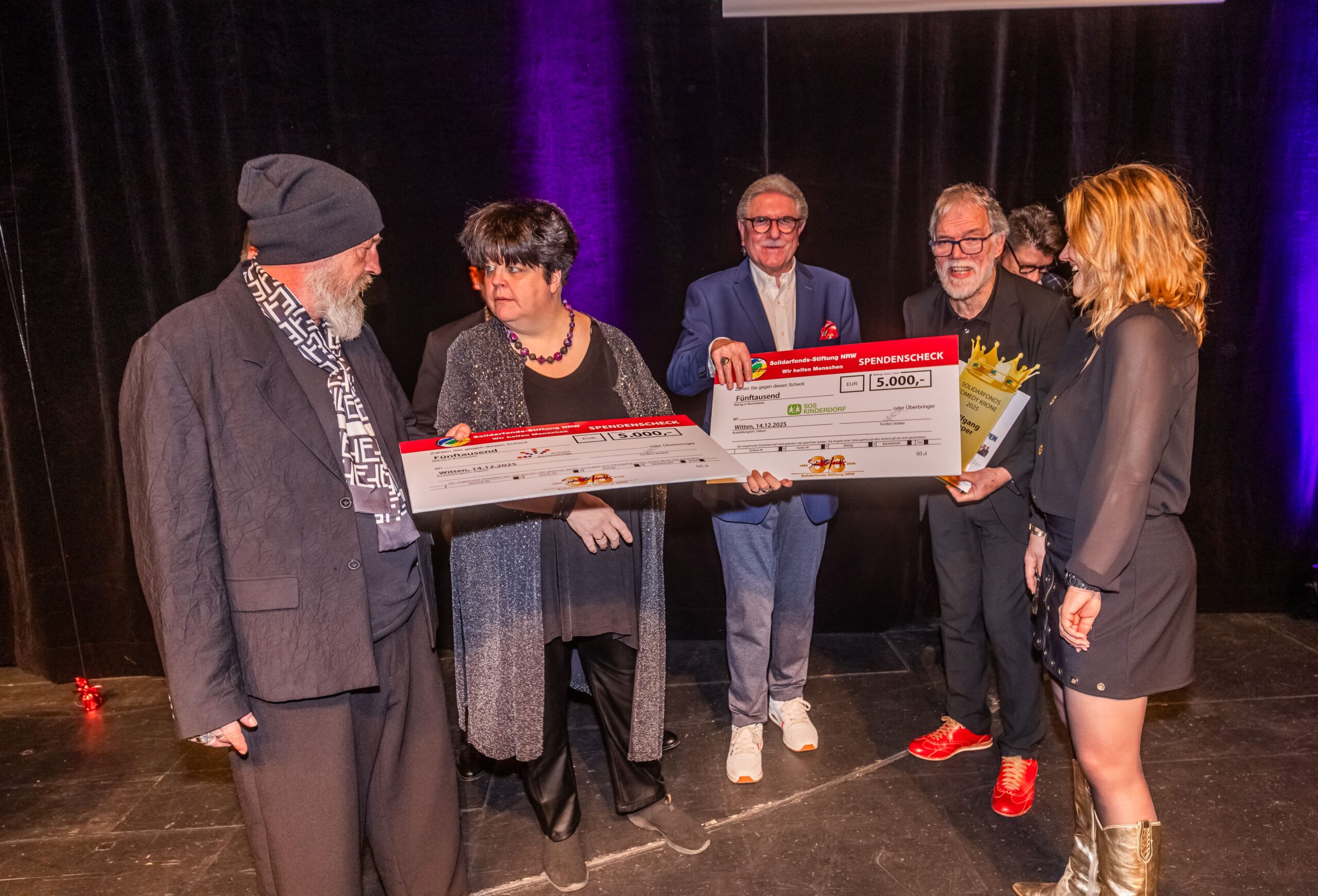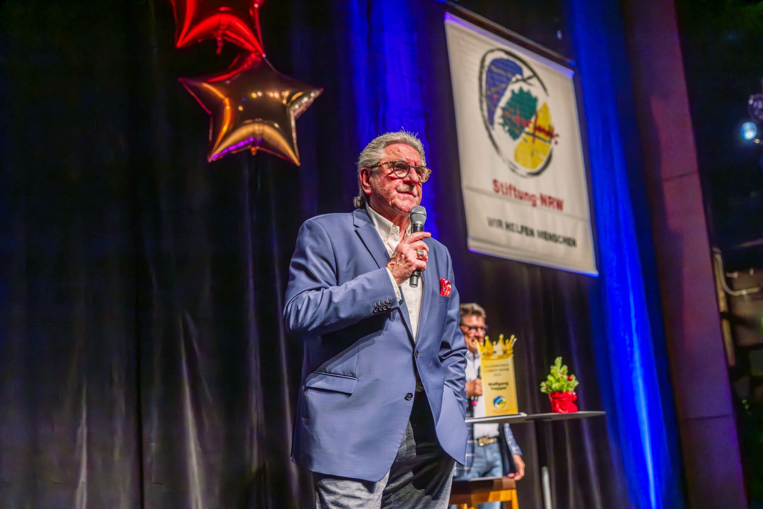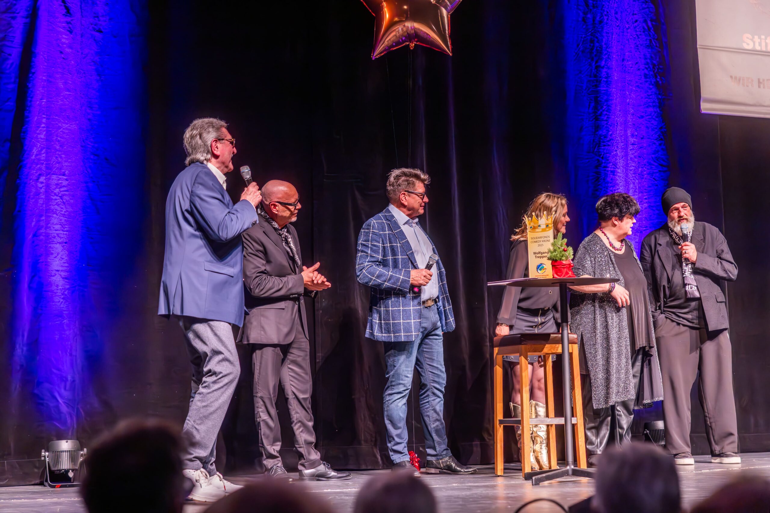 Zum Finale wurde es feierlich: Dr. Michael Kohlmann überreichte mit dem Schlagersänger und Stiftungs-Vorstandskollegen Olaf Henning die Goldene Comedy-Krone an Wolfgang Trepper. Der Preis wurde zum zweiten Mal für besondere Verdienste für die Solidarfonds-Stiftung NRW verliehen. Erster Preisträger war 2024 Torsten Sträter.