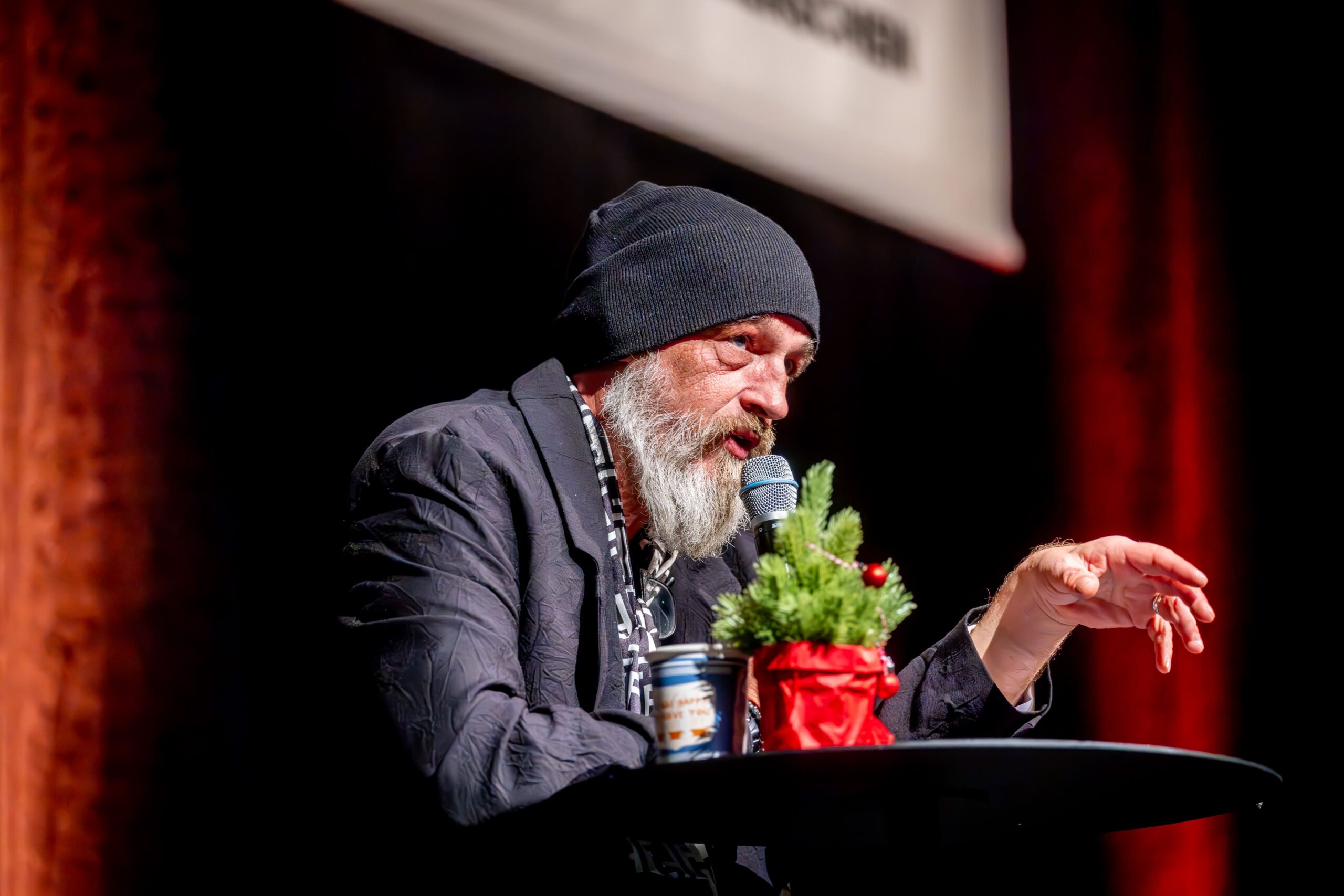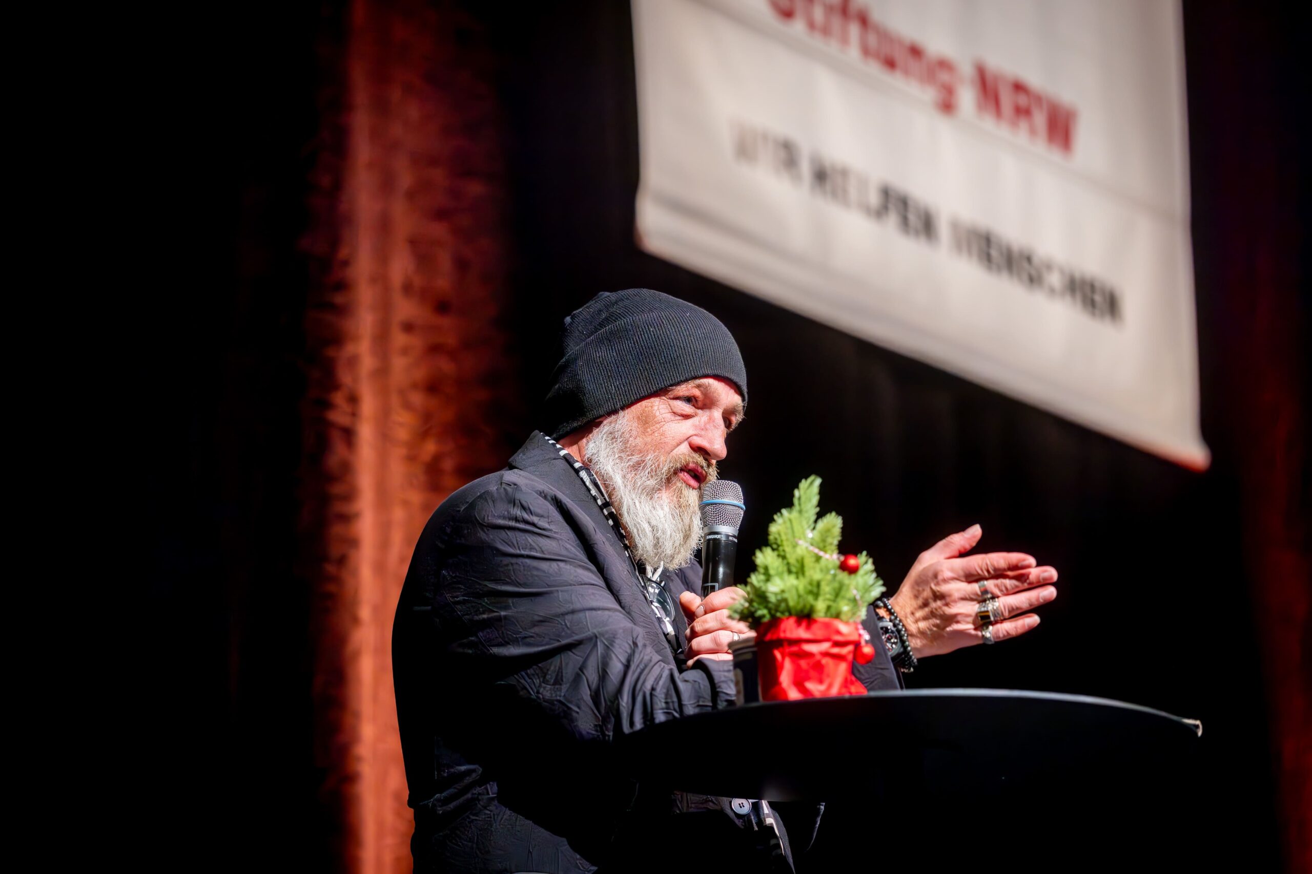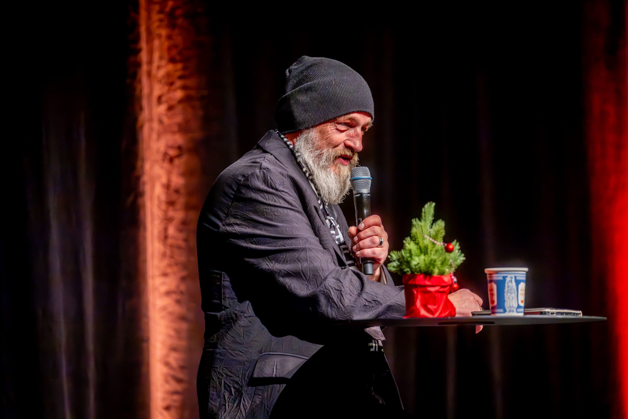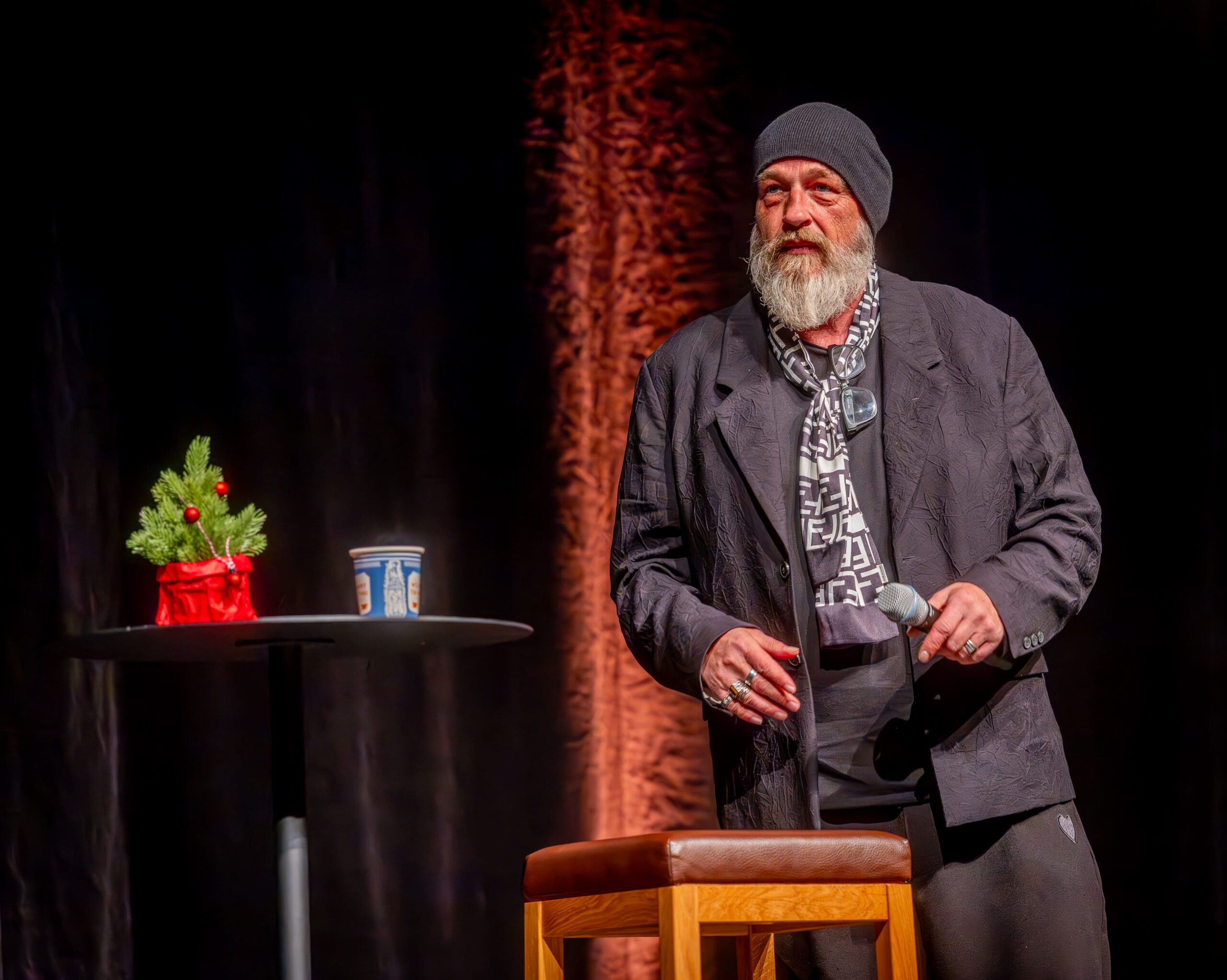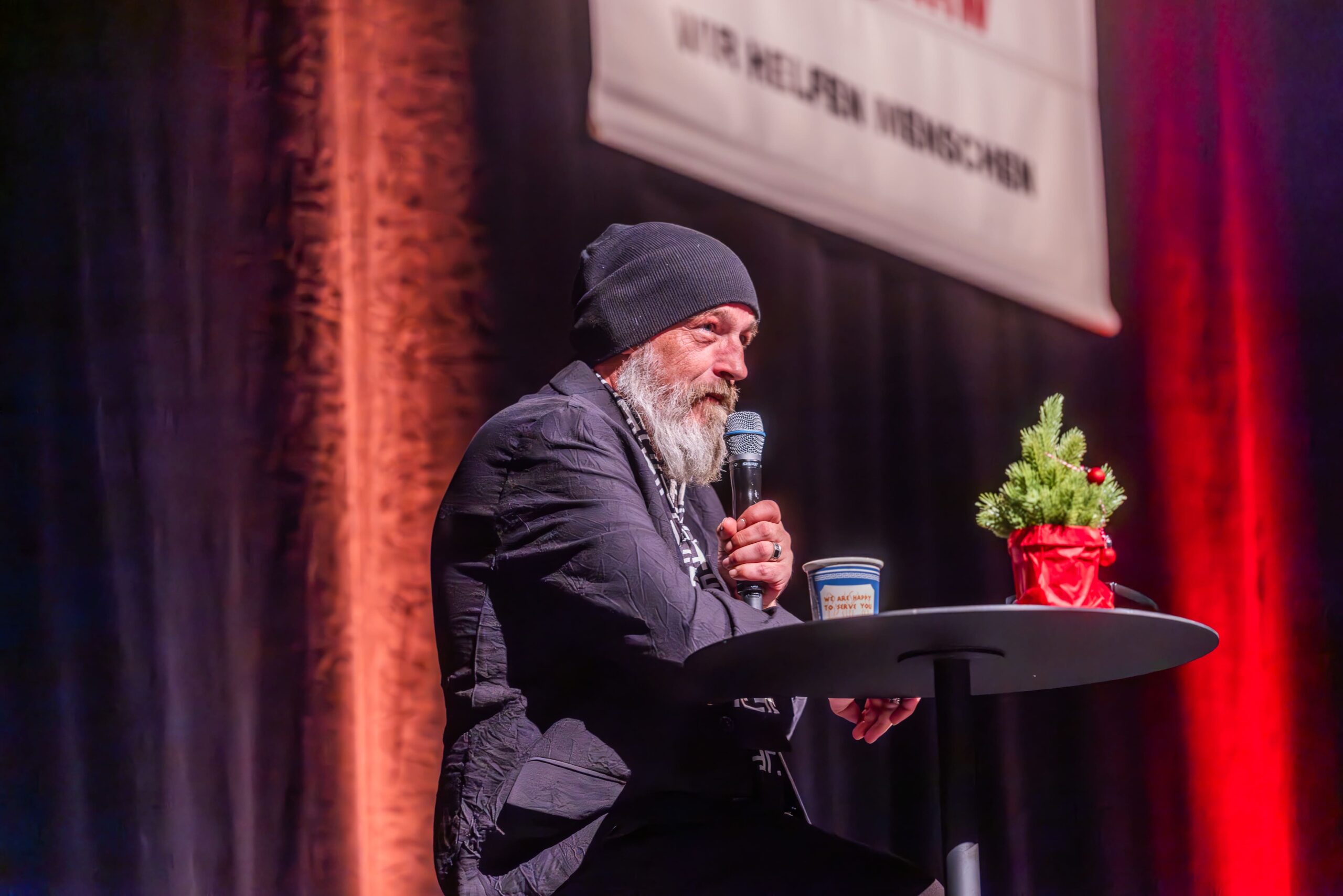 Torsten Sträter ist der Weihnachtsmatinee seit 15 Jahren verbunden. Dabei ist er ein bekennender Morgenmuffel. Mittags aufzutreten: Für den Mann mit Mütze, der die größten Hallen der Republik füllt, fühlt sich das an wie mitten in der Nacht. Seine obligatorische Verspätung ist längst zum Running Gag bei den Matinee-Stammgästen ebenso wie bei seinen Kollegen avanciert. Die überbrückten die Pause (ein Besucher: „Warten aufs Christkind“) in perfekter Manier, ehe sich der Waltroper samt Kaffee in bemerkenswerter Früh-Form präsentierte. Passierte Tomaten im Supermarkt werfen bei ihm eine Frage auf: „Was, zum Teufel, ist denen passiert?“